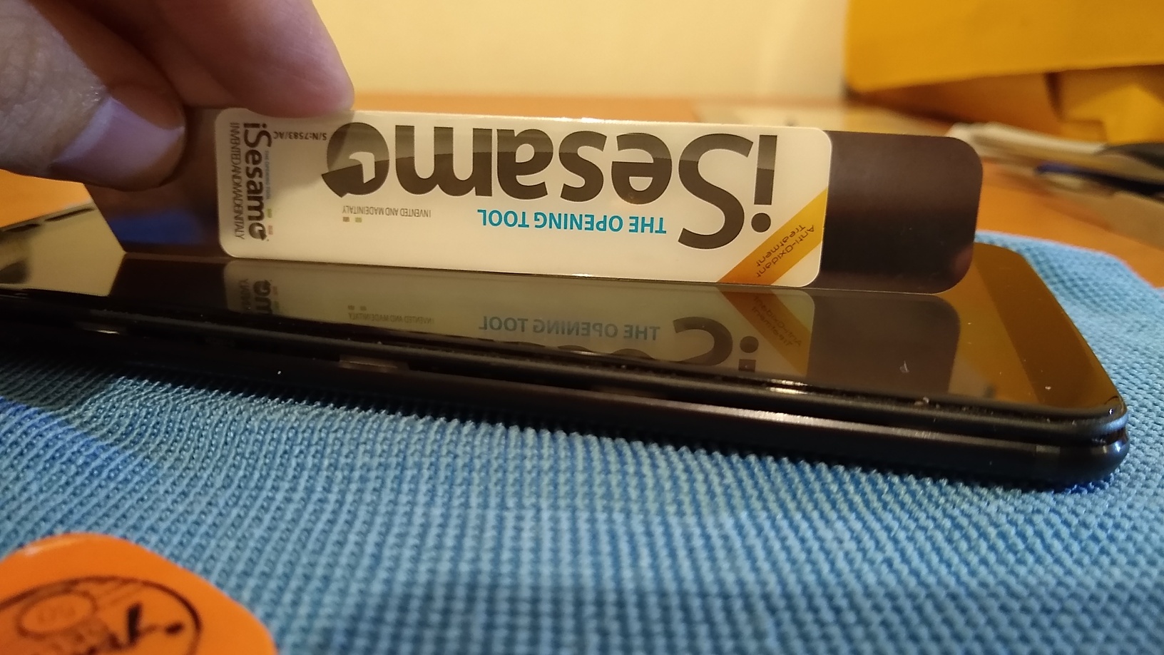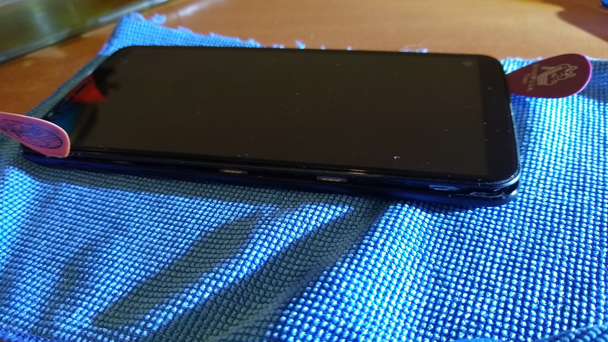 4. Pasando todo alrededor, tal como indica la guía de iFixit. Este celular no se cierra con pegamento, se cierra solo con clips. No se rompió ninguno. Aun así es a prueba de salpicaduras muy ligeras, lo he usado en varias lloviznas, pero no en lluvias. A responsabilidad de cada uno, porque no es 100% a prueba de agua, a pesar que mucha gente en youtube hundió este celular en jarras, de tan bien cerrado que está, y supuestamente el port de carga sí es a prueba de agua electricamente.